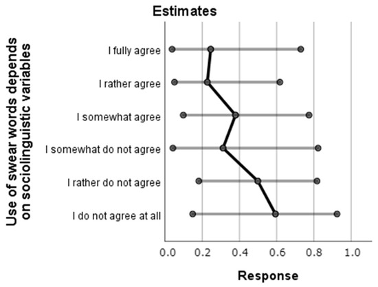 The results are also consistent with our last hypothesis (Hypothesis 4), in the sense that learners’ attitudes towards the use of taboo expressions, including context-related and sociolinguistic aspects, influence the comprehension of taboo expressions. On the one hand, as to the attitudes towards the effect of the context, those students that agreed on the role of the conversational context outperformed those that somewhat agreed or did not agree at all. In other words, an increased awareness of the context-dependent use of taboo expressions went along with an increased proportion of correct responses (Rather agree and fully agree EMM = 0.566, SE = 0.243, somewhat in between M = 0.464, SE = 0.222, I do not agree and I rather do not agree M = 0.148, SE = 0.099). The fixed effect was found to be significant (F(2, 305) = 3.947, p = 0.020), with the level somewhat in between having 16.181 times the odds of having a correct answer compared to the level I do not agree and I rather do not agree (β = 2.784, p = 0.000, 95% CI 3.630, 72.126). On the other hand, attitudes toward the impact of sociolinguistic aspects on taboo use exhibited a consistent pattern overall: The more individuals agreed with the influence of sociolinguistic variables (such as lower socioeconomic status or lower education level) on the frequency of taboo use, the fewer correct responses they produced (see Figure 4). However, no significant fixed effect was found for this factor (F(5, 305) = 3.947, p = 0.244).