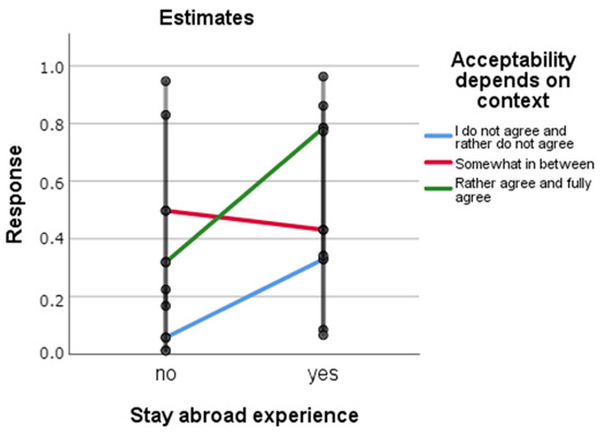 Figure 5. Estimated marginal means of response (0 false; 1 correct) by stay-abroad experience and the attitudes towards the influence of contextual variables on swear word use.