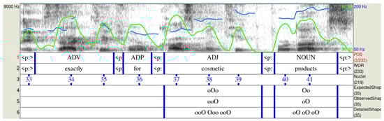 In Figure 1, an example output is presented with POS tags and text on tiers 1 and 2, syllable nuclei on tier 3, expected prosodic shape from the CMU dictionary on tier 4, and the observed global prosodic shape on tier 5, which is a merge of F0, intensity, and duration values from tier 6. Note that only a binary stress representation is shown here, but there is a centile value behind each “o/O” symbol. In this example, only two syllables are detected within the boundaries of the word “exactly”, which expects three syllables according to the CMU dictionary; thus, this word is excluded from the analysis. The last syllable in both target words “cosmetic” and “products” appears to be prominent, although stress is expected on the second and first syllable, respectively.