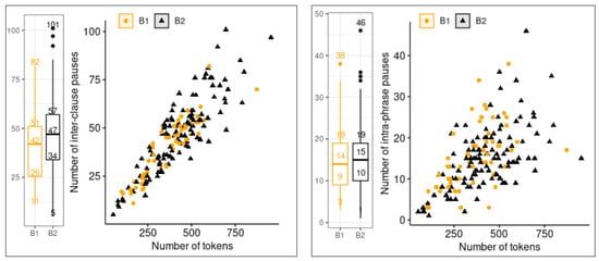 To further analyze the structural aspects, the number of pauses between clauses and within phrases was examined. As might be expected, B2 students make on average more pauses between clauses (47 pauses) compared with B1 students (42), demonstrating a significant difference at . Nonetheless, they display the same quantity of pauses within phrases (14 and 15 pauses, respectively). Figure 2 shows that, with an equal number of tokens, students can have a significantly varied number of intra-phrase pauses (such as 10 or 36 pauses for two B2 students at 500 tokens). However, the variation for inter-clause pauses is much narrower.