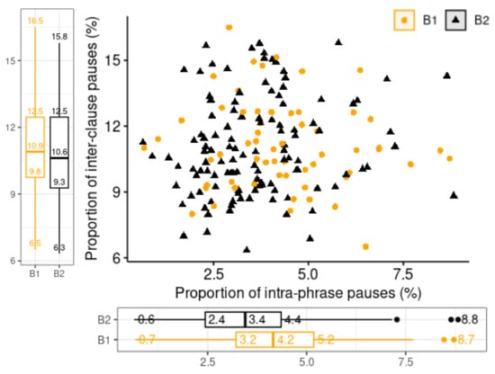 When comparing the number of pauses per 100 tokens to mitigate the effect of speech quantity, B2 speakers make significantly less pauses within phrases than B1 speakers (4.2% for B1 and 3.4% for B2 at ), but there are as many of them at clause boundaries (10.9% for B1 and 10.6% for B2, exhibiting no significant difference). Figure 3 shows that there is no observable correlation between the proportion of pauses between clauses and within phrases for both groups.