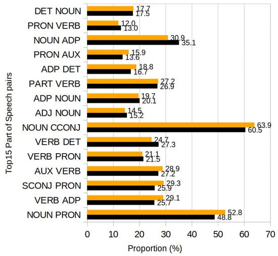 Furthermore, the pausing patterns at the lexical level between B1 and B2 were analyzed. We now focus on the immediate syntactic context of pauses within the top 15 most frequent consecutive POS pairs noted in the corpus. The proportion of occurrences with a pause was calculated for each pair within both the B1 and B2 subcorpora. This analysis enabled a comparison of pausing tendencies between B1 and B2 students within each context. As shown in Figure 4, despite a subtle difference, the results show that B2 students generally make fewer pauses than B1 students within these 15 contexts, with the largest gaps observed between nouns and pronouns (−4 points), nouns and coordination conjunctions (−3.5 points), and subordinate conjunctions (SCONJ) and pronouns (−3.4 points). Notably, these contexts are likely to be clause boundaries, which contradicts the hypothesis that B2 students make more pauses between clauses to enhance speech structure. However, B2 students noticeably make more pauses than B1 students in two contexts: between nouns and prepositions (ADP, +4.2 points) and between verbs and determinants (DET, +2.7 points), which likely indicate phrase boundaries.