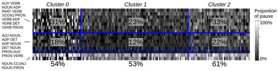 The unsupervised co-clustering method () was applied to students and their pausing patterns within the 15 analyzed contexts. As a result, three distinct student clusters were identified, as depicted in Figure 5. These clusters exhibit two predominant profiles that are primarily differentiated by the overall frequency of pauses (clusters 1 and 2). Additionally, there is an additional cluster (cluster 0, on the left) consisting of students with extreme values, likely due to insufficient observations in certain contexts, leading to a less homogeneous group of speakers. Cluster 2 demonstrated a higher frequency of pauses across all 15 contexts, and encompassed 53% of B2 students and 42% of B1 students. In contrast, cluster 1 included 28% of B2 students and 29% of B1 students, and cluster 0 consisted of 19% of B2 students and 29% of B1 students.