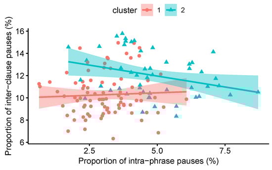 When plotting the proportions of inter-clausal and intra-phrasal pauses for each speaker from clusters 1 and 2 (cf. Figure 7), it is evident that there is no significant correlation between both types of pauses among students from cluster 1. However, there is one among those of cluster 2, in which students who make more inter-clausal pauses tend to make fewer intra-phrasal ones (, ).