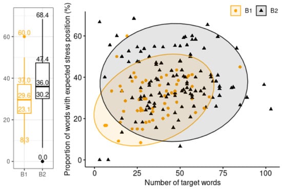 The second investigation aimed to determine whether B2 learners achieve a higher stress position score compared with B1 learners. While both groups’ distributions are widely dispersed and significantly overlap, on average, B2 learners significantly outperform B1 group, with expected stress position rates of 36% compared with 29.6%, and a significant difference at p < 0.0001. Figure 8 shows a projection of each speaker on the basis of their stress position score and number of target words. Only two B1 speakers surpassed 50%, while 26 B2 speakers (representing 22% of the B2 group) achieved this level.