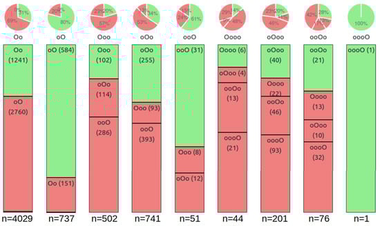 The percentage of words with incorrect stress position increases proportionally with the number of syllables: 62% for two-syllable words, 70% for three-syllable words, 79% for four-syllable words, and 81% for five-syllable words. In Figure 9, the production of each expected word shape by all speakers can be observed. Notably, 85% of two-syllable words are expected to have stress on the first syllable; however, only 31% of these occurrences carry stress on the first syllable, while 69% receive stress on the last syllable. Conversely, the majority of expected oO-shape words (79%) are correctly stressed. A similar pattern emerges for three- and four-syllable words, where most words are effectively stressed on the last syllable, despite this being relatively rare in English, as stress is predominantly expected on the second or first syllable.