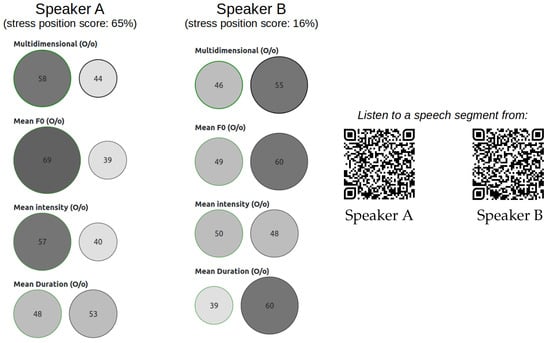 Figure 10 shows the average contrast between stressed and unstressed syllables in words produced by two B2 proficiency level speakers. Speaker A correctly stressed 65% of her words, while speaker B achieved only 16% accuracy in stress placement. The number inside each circle refers to the speaker-normalized centile value of prominence (the higher, the more prominent). For speaker A, the expected stressed syllables were on average 30 points higher in F0 compared with the adjacent syllables, along with a 17-point higher amplitude, while the duration remained almost unchanged (−4 points). This resulted in a mean acoustic contrast of a 14-point increase for the expected stressed syllable. In contrast, speaker B demonstrated a negative contrast due to the tendency to emphasize the wrong syllable (often the last one). The expected stressed syllable was on average 21-point shorter and 11-point lower in F0, with no noticeable change in intensity (+3 points). This pattern was also observed with other speakers scoring high or low in the stress position. The former group accentuated words primarily by increasing the F0, then intensity, with no significant change in duration, while the latter group consistently increased the duration of unstressed syllables, along with an F0 increase and no noticeable change in intensity.