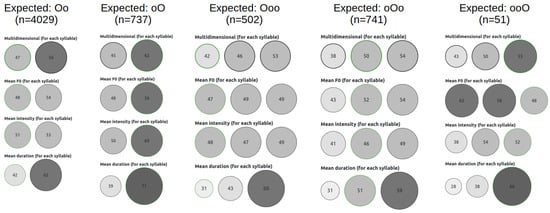 As shown in Figure 11, for all speakers, regardless of their stress position score, the prominent syllable is mainly characterized by a longer duration (increase of +20% and +32% for expected Oo and oO shapes, and +23%, +18%, and +33% relative to the mean duration of unstressed syllables for expected Ooo, oOo, and ooO shapes). The changes in F0 and intensity are less pronounced, with increases of +6% and +8% in F0, and +2% and +10% in intensity for expected Oo and oO shapes, respectively, and +1%, +6%, and −12% in F0, and +2%, +5%, and +6% in intensity relative to the mean of unstressed syllables for expected Ooo, oOo, and ooO shapes, respectively.