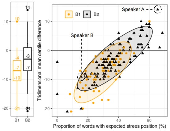 The difference in the mean acoustic contrast between expected stressed and unstressed syllables among the B1 and B2 proficiency groups is statistically significant (median at −7 for B1 and −3 for B2 speakers, with p < 0.0001), and strongly correlated with the proportion of words with the expected stress position for both proficiency groups (, , cf. Figure 12).