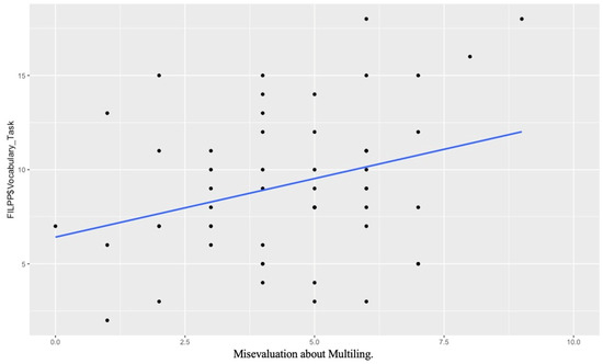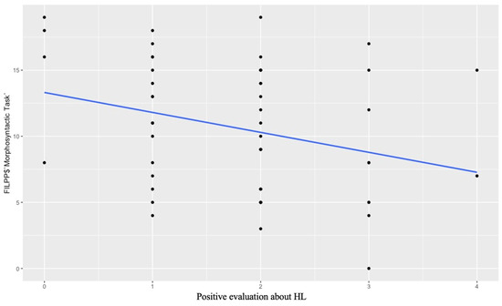 Concerning morphosyntactic comprehension as dependent variable, the misevaluation of multilingualism resulted in a trend towards significance (p = 0.06), with a negative estimate (β = −1.30344), meaning that the worse idea parents have about their being multilingual, the worse children perform in terms of morphosyntactic comprehension in their HL (see Figure 2). Moreover, the language choices held by the parents do not seem to affect children’s morphosyntactic comprehension skills (usage of HL: p = 0.338; usage of Italian: p = 0.453; usage of both languages: p = 0.954) (see Table 3 for extensive results concerning morphosyntactic comprehension as dependent variable).