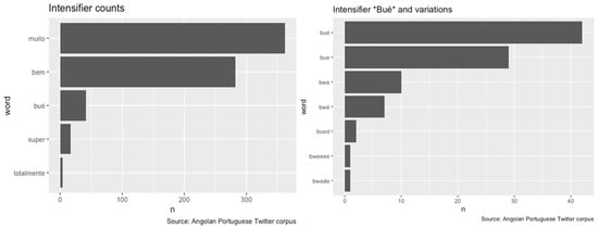 For the present study, we compiled a corpus of 10,000 geo-tagged tweets from Luanda, Angola, in September of 2021, using the scripting and software environment R () and the package Rtweet (). Retweets were not included in the corpus as a way to prevent gathering repeated tweets and bots. Furthermore, tweets are mixed, specified by the argument “type”. The search string targeted a list of five high-frequency adjectives (bom|boa ‘good’, feliz ‘happy’, fixe ‘cool’, triste ‘sad’, especial ‘special’) determined by a search on the Angolan Portuguese portion of the Reference Corpus of Contemporary Portuguese (). Thus, every tweet contains at least one of these adjectives specified in the search. The reasoning behind this methodological decision is that intensifiers are more frequently found modifying adjectives in comparison to other parts of speech (). Further processing of the data included checking for its quality (i.e., number of empty values, duplicates, and consistency), cleaning (i.e., stripping the punctuation, case conversion, and removal of stop words), tokenization, and tagging. The tagging was performed using the R package Udpipe (), due to its high performance and simplicity (). The package offers a great number of pre-trained language models, including Portuguese.