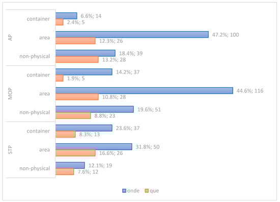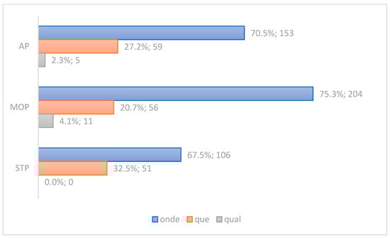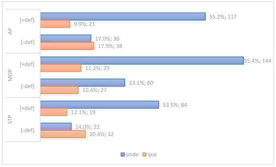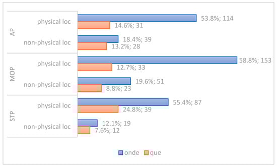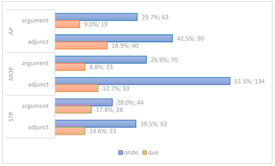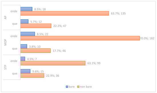 For the purpose of this paper, we proceeded to extract all the contexts with the relative markers onde, ‘where’, que, ‘which/that’, and qual/quais, ‘which’, from the searchable CQPweb platform (Hardie 2012) hosting the three corpora, and then manually excluded all the contexts which do not concern relative clauses of spatial location, as well as unclear contexts.3 In doing so, we identified a total of 645 relevant contexts: 217 for AP; 271 for MOP; and 157 for STP, as shown in Figure 1 below, which includes the numbers and percentages per variety.