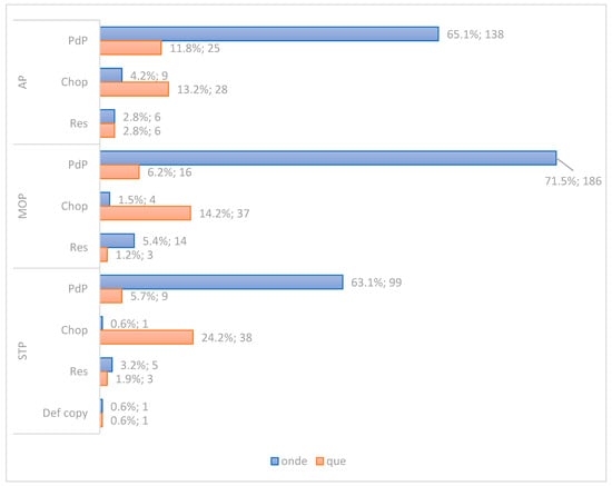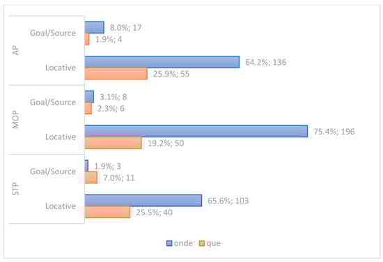 Locative relative clauses formed with qual/quais are practically absent (AP and MOP) or inexistent (STP) in our data, which is in line with tendencies observed in other work on relativization in European Portuguese (e.g., Rinke and Aßmann 2017; Alexandre et al. 2011a; Arim et al. 2004; Selas 2014). We therefore excluded a total of 16 occurrences of qual/quais from further analysis, focusing exclusively on data involving relativizer onde, which is dominant in the three AVP (68–75%), and que, which is also common (21–33%). This yields a final total of 629 contexts: 212 for AP; 260 for MOP; and 157 for STP.