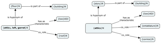 Examples built based on the definitions and synsets presented in Amaro and Mendes (2012, p. 152), and in American Heritage® Dictionary of the English Language, Fifth Edition, 2016, and Collins English Dictionary—Complete and Unabridged, 12th Edition 2014 (https://www.thefreedictionary.com/attic), (accessed on 1 January 2023).