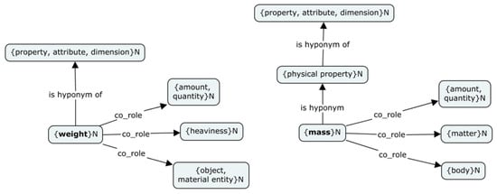 Figure 4. {weight}N common noun synset and {mass}N specialized noun synset from the physics domain.