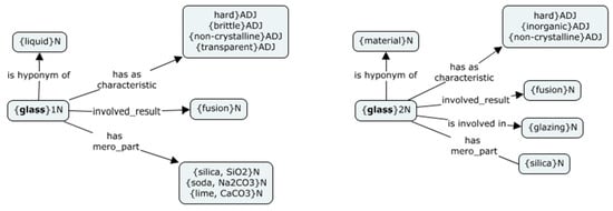 Figure 5. {glass}1N specialized noun synset from the chemistry domain and {glass}2N specialized noun synset from the materials engineering domain.