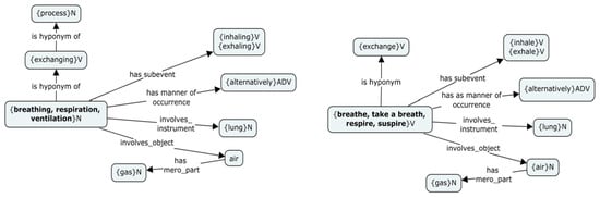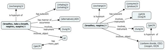 Figure 7. {breathe1, take a breath, respire1, suspire}V common verb synset vs. {breathe2, respire2}V specialized verb synset from the biology domain.