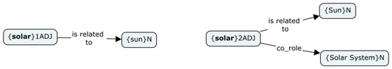 Figure 9. {solar]1ADJ common relational adjective synset vs. {solar}2ADJ specialized relational adjective synset from the astronomy domain.