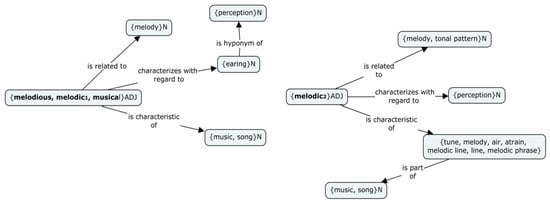 Figure 10. {melodious, melodic1, musical}ADJ common adjective synset vs. {melodic2}ADJ specialized adjective synset from the music domain.