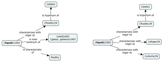 Figure 11. {liquid}1ADJ common adjective synset vs. {liquid}2ADJ specialized adjective synset from the chemistry domain.