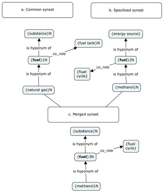 Incompatible synsets: the specialized and common nodes, though related, do not share elements in the hypernym chain, directly or indirectly. In that case, there is no possible merging.
