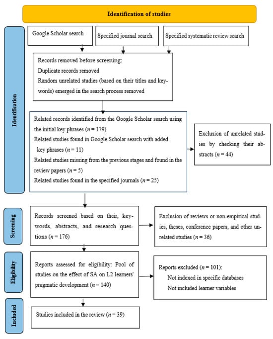 The studies were collected through a sequential process of (a) web search engine, (b) similar review studies’ search, (c) journal search, and (d) exclusion/inclusion based on the specified criteria to cover major studies on the role of learner variables in L2 learners’ pragmatic development during their SA from credible field-specific journals.