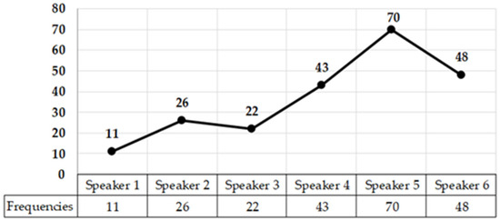 In the conversations of the six informants, a total of 220 silences were observed. The recorded frequencies range from 11 to 70 silences per informant (with a mean of 36.6). The silence within the women’s group exhibits a high variance (377.8) and a standard deviation (453.4) considerably above the mean. This indicates that the frequency of silences among the women of the corpus is very heterogeneous. As will be seen, this apparent disparity is partly related to the gender of the interlocutor. In cases where the women in the study talk with men (speakers 4, 5, and 6), more silences occur than when they talk with other women (speakers 1, 2, and 3) as can be seen in Figure 2.