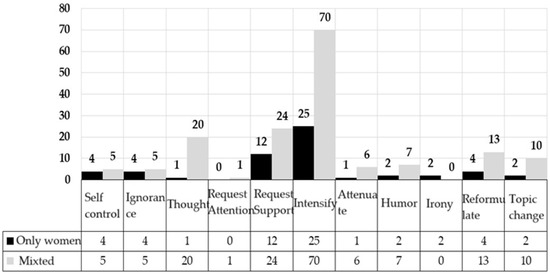 Pragmatic functions in relation to the gender participation framework (only women or mixed-gender).