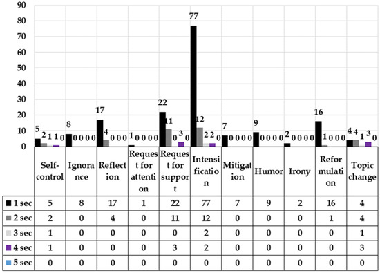 Variation is also evident in the durations. On the one hand, there are functions with average durations between 1.0 and 1.5 s, such as silences for irony, mitigation, reformulation, humor, reflection, and intensification. On the other hand, there are functions with average durations ranging from 1.5 to 2.5 s, including silences for expressing ignorance, hesitation or doubt, self-control, seeking support, and changing the topic. These details can be observed in Table 1.