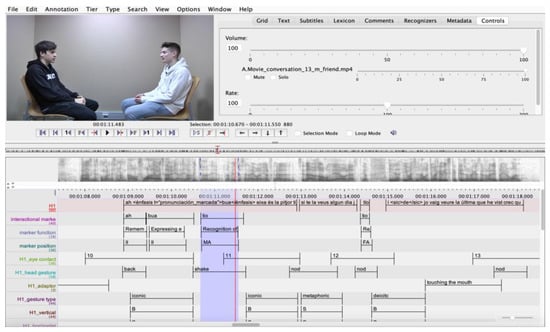 In this particular investigation, the analysis variables involved the combination of pragmatic markers, their pragmatic function, and their position in conjunction with different multimodal annotation variables, such as facial gestures, manual gestures, head movements, eye gaze, and adaptors. A screenshot of the ELAN panel can be seen in Figure 1.