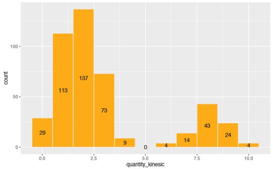 The information that can be derived from the histogram is that pragmatic markers consistently exhibited a certain polarity in the quantity of multimodal elements utilized. They were frequently accompanied by multimodal cues, as evidenced by 421 out of 450 records. Additionally, there was a noticeable distinction between a small number of multimodal elements (ranging from 2 to 3 variables) and a larger number of co-occurring values (ranging from 8 to 9).