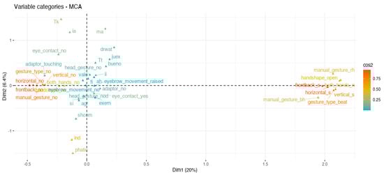 The data were processed with descriptive quantitative statistics to find out the co-occurrences between co-speech gestures and multimodal cues, and pragmatic markers more generally. Moreover, to enhance our analysis, we utilized exploratory multifactorial statistical visualization techniques, specifically multiple correspondence analysis (MCA) and cluster analysis. These techniques were implemented using the FactoMineR package developed by (Lê et al. 2008). By employing these methods, we were able to generate comprehensive profiles for the pragmatic markers under investigation.