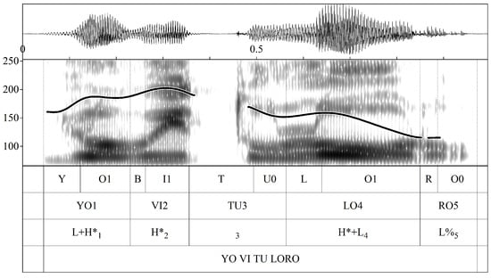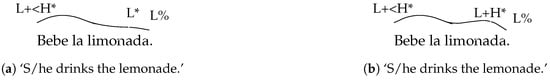 The stressed syllable is the first ‘be’ in Figure 1a,b. Recall that both of these examples correspond to the answer for the question ‘What does s/he do?’, and in either case, the first F0 peak is late aligned relative to the accented syllable (i.e., the first stressed syllable, in this case). On the other hand, nuclear intonation (i.e., final intonation) could present two possibilities: The first option is a smooth falling interpolation which spreads from the first F0 peak to the low boundary tone (L%), whose nuclear intonation has been annotated as L* L%, as illustrated in Figure 1a. The second option is a nuclear intonation showing a rising contour reaching a peak associated with the accented syllable (L+H*), and just before the L% tone, as Figure 1b demonstrates (examples taken from , p. 364). While changes in the pragmatic meanings have not been attested between these two nuclear possibilities, they appear to be an example of allotonic variation across Spanish intonation so far.