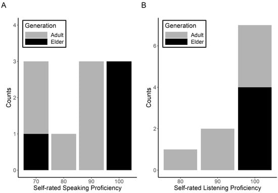 (A) Self-rated speaking proficiency in Palenquero. (B) Self-rated listening proficiency in Palenquero (N = 10).