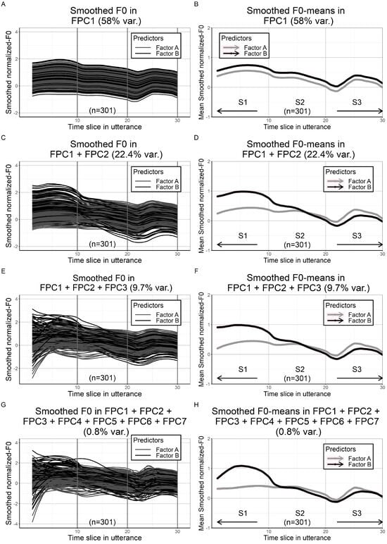 In order to illustrate this process, a sample dataset with 301 three-syllable contours, coming from two different predictors (Factor A and Factor B), is shown in Figure 3. It should be noted that the F0 contours presented in this section are by no means the actual contours studied in this paper. The FPCA performed in this illustrative dataset is visualized in Figure 4. Intonational data from Factors A and B are shown in Figure 3A, while averaged contours are presented in Figure 3B. FPCA helps find the most substantial modes of F0 variation, as illustrated in Figure 3A, so that we can visualize the average contours towards which actual contours are trending, and infer pitch accents whenever possible. Figure 4 shows the first three most substantial variances in these contours (see Figure 4A–F), as well as the entire reconstruction of intonation contours after having cumulatively added seven FPCs (see Figure 4G,H). Each FPC is one dimension of intonation contours, and is also the dependent variable for predictors, as presented in the following section.