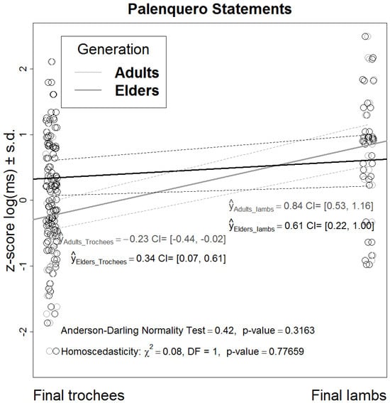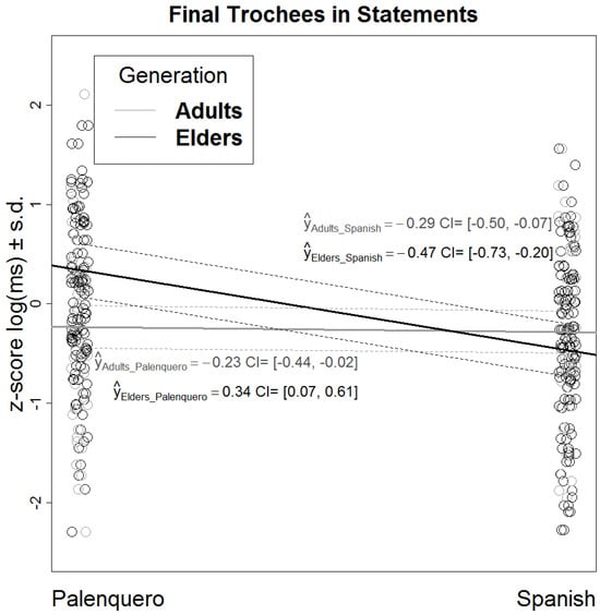 A total of 240 utterances were collected, but after removing outliers and influential points using Cook’s distance () and the car package in R (), 231 statements were considered for phrase-final lengthening analysis, and 196 statements were deemed to be optimal for the intonation analyses. Phrase-final lengthening analysis, including both penultimate and final lengthening, required the automatic extraction of vowel length from penultimate and final syllables. Thus, penultimate and final lengthening effects were accounted for by the statistical analysis of vowel length. Measurements were normalized by the subject being log-transformed and scaled as z-scores in R, following (). This is the main reason why results will be reported as units, which in practice are standard deviations (SDs). The regression equation that best described the linear association between vowel length with final stress, language, and generation, was found by conducting automatic forward and backward stepwise regressions, with the R function step (). In order to make regression results more readable and interpretable, predictors’ levels were dummy-coded to be zero or one. That is, final trochee, Palenquero, and adult were coded as zero (0), while final iamb, Spanish, and elderly were coded as one (1). Random effects of speakers’ variation on the intercept were accounted for by the linear mixed-effects model, for completeness.