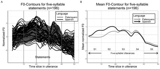 Palenquero is a creole language that has developed in San Basilio de Palenque, Colombia (South America), from the contact of African people with Spanish conquerors during the times of slavery and abduction in African lands. The most salient prosody of Palenquero creole was described as a type of phrase-final “cadence” (; ), correlated acoustically with a falling pitch and a lengthening effect, stretched from the penultimate syllable until the end of the statement (; ). In addition to this, it has been shown that statement intonation, in Palenquero, tends to be flat or, at least, exhibits plateau-shaped contours in most cases, and also that penultimate lengthening is ostensibly more frequent in Palenquero than Spanish (). On the other hand, Spanish broad-focus statements are typically realized with a steeper rise whose peak is reached later in prenuclear intonation (i.e., non-final intonation). This rise tends to be followed by a declination whereby statements describe a falling intonation for the most part of the utterance (see ; ). Therefore, flat or plateau-shaped contours do not seem to be frequent throughout unmarked statements in more Spanish dialects.