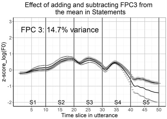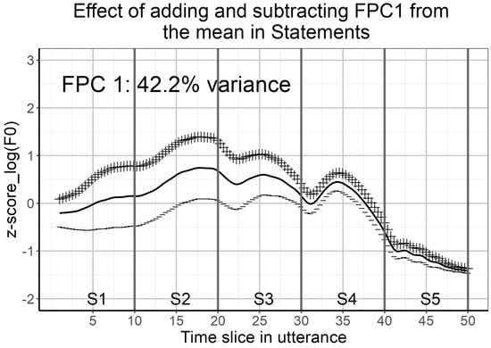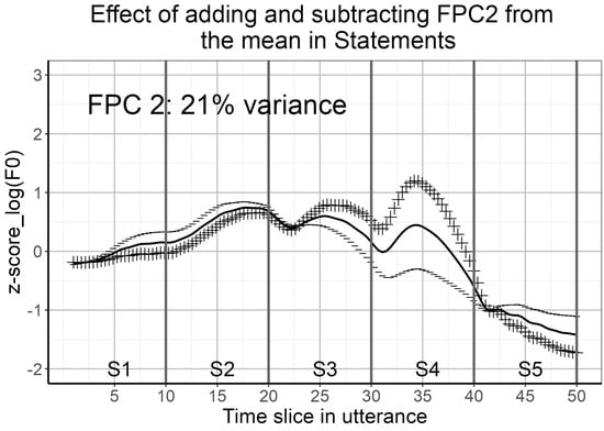 Intonation as a physical property is the modulation of vocal fold vibration; hence, intonational data are high dimensional, and involve much variation. However, FPCA helps understand how this variation occurs by revealing the most substantial modes of variation, and showing towards which intonational pattern F0 contours are trending. Variance is then partitioned into functional principal components (FPCs), and each FPC corresponds to one dimension that captures one portion of the whole variance. In a second step, linear regression analyses are performed in order to explain the variance accounted for by each FPC. That is, main, interaction, and random effects are tested to predict the variance contained in each FPC (see ; ). FPCA is a data-driven semi-automatic analysis used to understand the dominant or the most substantial modes of variation in functional data while projecting the variances as smoothed curves generated from the same data (); (). To the best of my knowledge, projecting FPCs onto eigenvectors as smoothed intonation contours is the only way the variance contained in one dimension may be visually understood. Each projected FPC could reveal different pitch contours, and, furthermore, when they are incrementally added, the total variance can be reconstructed.