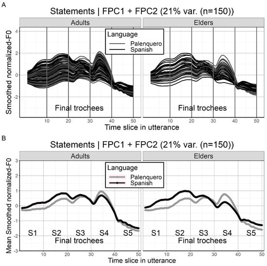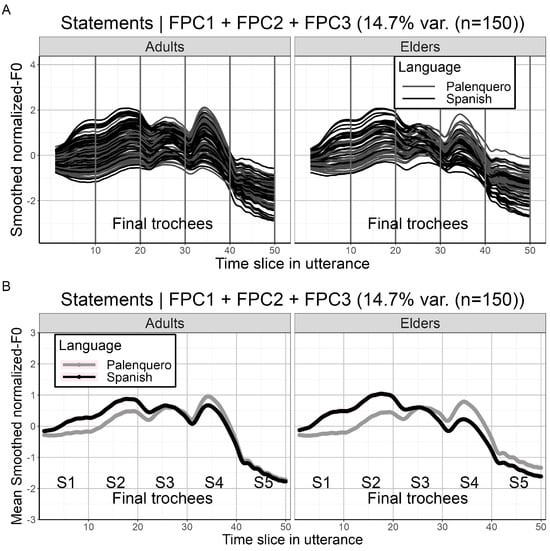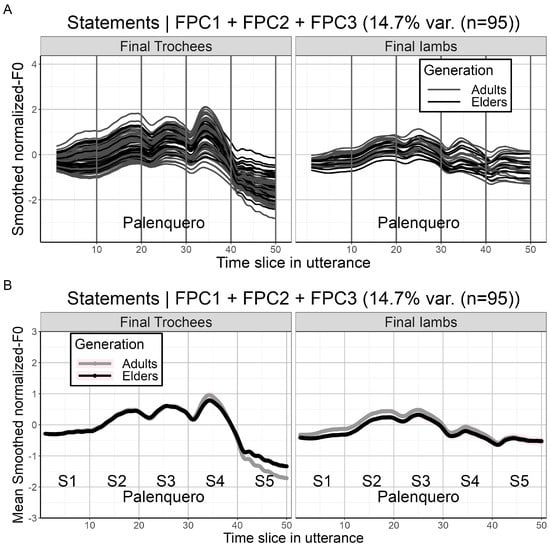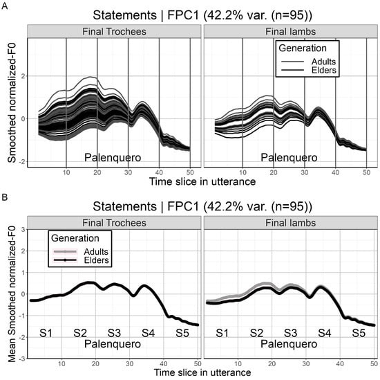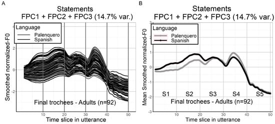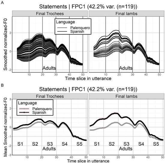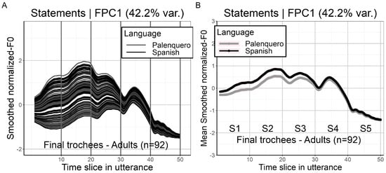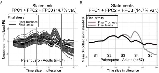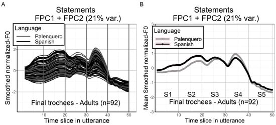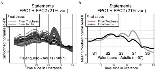The analysis of intonation contours was conducted using functional principal component analysis (FPCA) (); () along with linear regression analyses. The former required an exhaustive data preparation and normalization of intonation contours. The entire process may be outlined in three major steps: Firstly, F0 contours were time-normalized by extracting ten F0 points per syllable, having fifty points per utterance. Then, F0 samples were automatically extracted at equidistant times on each syllable using ProsodyPro (). Second, pitch ranges were normalized by subject, by transforming F0 points as log values and turning them into z-scores. This means that the mean for each subject’s range was zero. It is the reason why intonational differences represent, in practice, standard deviations (SDs). At this point, outliers and influential intonation points were manually transformed into NAs (not available). Third, FPCA was performed in order to reduce F0 dimensionality, and simultaneously obtain the most substantial modes of F0 variations (i.e., the functional principal components (FPCs)). The R-package fda () was used to serve this purpose. The most substantial modes of F0 variation, resulting from FPCA, were analyzed incrementally from the first FPC through the one which, after being cumulatively added, covered approximately 80% of the total variance. It means that FPC2 was cumulatively added to FPC1, and then FPC3 to FPC2 and FPC1, and so on, until the cumulative addition of variances covered approximately 80% of the total variance. The linear equation to explain the mode of F0 variance contained in each FPC was found using forward and backward stepwise regressions, and model comparisons, in order to find predictors and interactions that best explain the relationship between each FPC with final stress, language, and generation. Backward and forward stepwise regressions were achieved with the R function step (). Random effects of speakers’ variation on the intercept of each FPC were accounted for by the linear mixed-effects models for completeness.