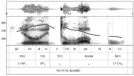 Phrase-final lengthening is one of the dimensions that might help understand the extent to which Palenquero/Spanish bilinguals keep their two languages prosodically distinct. Although the final “cadence” of Palenquero was impressionistically described like this by () and (), thanks to the development of speech technologies, this can now be acoustically associated with a sustained H tone followed by a falling pitch occurring in tandem with a lengthening effect which stretches from the penultimate syllable until the end of the utterance (). Clearly of relevance to this study is the claim that Palenquero/Spanish bilinguals produce more penultimate lengthening in Palenquero than Spanish (, p. 264). While this phonological process has not been reported in Caribbean Spanish varieties, some Bantu languages exhibit a process of penultimate lengthening in phrase-final position (see ), which might be another pattern from African origin. Therefore, it is reasonable to consider that penultimate lengthening may potentially contribute to language-specific intonation in Palenquero/Spanish bilinguals.