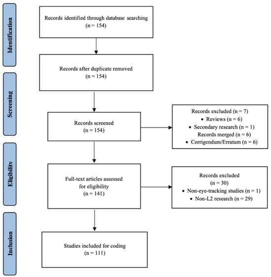 The dataset for this study was constructed through a sequential process following the Preferred Reporting Items for Systematic Reviews and Meta-Analyses (PRISMA) guidelines (Liberati et al. 2009; Moher et al. 2009) in December 2021. In line with the procedures used in previous research syntheses of L2 studies, this study focused on articles published in top-tier peer-reviewed journals because these journals have been considered as the primary means for disseminating high-quality L2 research (Marsden et al. 2018) (see Appendix B for the list of journals). To retrieve research papers that used the eye-tracking method in the selected journals, the Scopus database was chosen to conduct an electronic document search using the “source title” method because it is the largest available database of published studies (Aryadoust et al. 2021; Schotten et al. 2017). The search terms “eye tracking” and “eye movement” were applied using the “OR” Boolean operator. No limitation was set on the year of publications, but the language was restricted to English (Appendix C provides the Scopus search code). The initial search returned 154 articles.