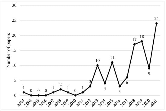 The final dataset consisted of 111 articles, published between January 2003 and December 2021. This dataset was substantially larger than those used in previous reviews of eye-tracking studies in L2 research (Abdel Latif 2019; Godfroid 2019), and could be considered as representative of the domain of interest. As shown in Figure 2, there has been a general upward trend in the number of papers using eye-tracking in L2 research, peaking at 25 in 2021. Since the publication year was not restricted in selection, it indicated that L2 studies that used the eye-tracking method emerged in the selected journals since 2003. This suggests that eye-tracking has become an established research method in L2 research and has gained more attention in recent years.