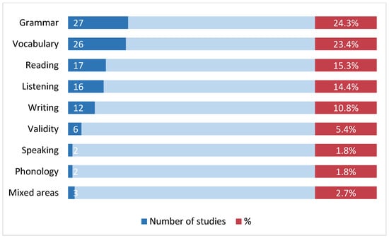 Figure 3 demonstrates the distribution of empirical L2 eye-tracking studies by research area. The categorization of studies was based on the primary area of research interest expressed by the researchers in the title, abstract, research aims, and research questions addressed by eye-tracking. Overall, eight main research areas and one mixed area emerged from the sample. Grammar (n = 27; 24.3%) is the most researched component, followed by vocabulary (n = 26; 23.4%), and reading (n = 17; 15.3%), while considerably less research attention has been directed to speaking (n = 2; 1.8%) and phonology (n = 2; 1.8%). In addition, as demonstrated in Table 4, several research areas consisted of two or more categories, indicating the span of the knowledge base in these research areas. For example, grammar studies tend to focus on grammar acquisition and instruction (e.g., Indrarathne and Kormos 2017; Wong and Ito 2018) and grammatical processing (e.g., Fujita and Cunnings 2021; Keating 2009), while listening research mainly focuses on predicting language processing (e.g., Kim and Grüter 2021; Mitsugi 2017), listening tests (e.g., Aryadoust et al. 2022; Suvorov 2015), and prosody (e.g., Connell et al. 2018; Wiener et al. 2021).