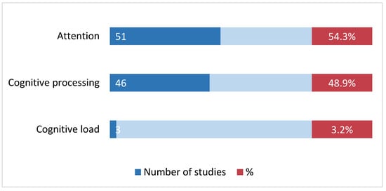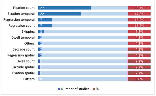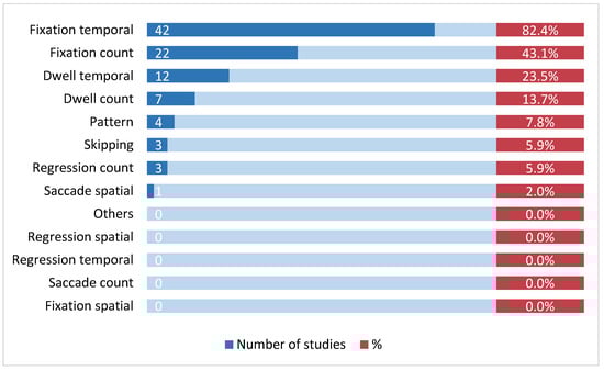 Attention emerged as the most studied cognitive mechanism in the sample. A total of 51 studies (54.3%) employed eye-tracking to measure, for example, the amount of attention, attentional distribution, and the allocation of attention. The measures used for analyzing attention spanned across eight eye-tracking measure types (Figure 5). The majority of these studies (n = 42; 82.4%) used fixation temporal measures, while 43.1% of the studies (n = 22) employed fixation count and 23.5% of the studies (n = 12) used dwell temporal measures. The other measure types included dwell count (n = 7; 13.7%), gaze pattern (n = 4; 7.8%), skip (n = 3; 5.9%), regression count (n = 3; 5.9%), and saccade spatial (n = 1; 2.0%), which were used less frequently.