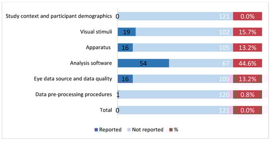 It can be seen that only five studies (4.1%) reported more than 70.0% of the variables, while most studies (n = 73; 60.3%) provided between 50.0% and 70.0% of the variables. Notably, 43 studies (35.5%) specified less than 50.0% of the items in their articles, underscoring the prevalent issue of incomplete reporting in previous eye-tracking studies in L2 research. The six groups of variables are unpacked in the following sections.