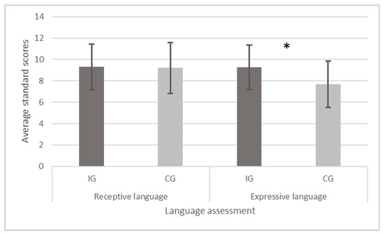 When the children were 18 months old, they reached average scores of 9.3 on the receptive language subscale from the BSID-III, 8.6 on the expressive language subscale, and 17.9 on the total language scale (see Table 2). The comparative analyses showed significant differences between the groups; the IG reached higher scores on the expressive language subscale (F(1, 64) = 6.38, p = 0.014, η2 = 0.102) compared to the CG, with a medium effect size (see Figure 1).