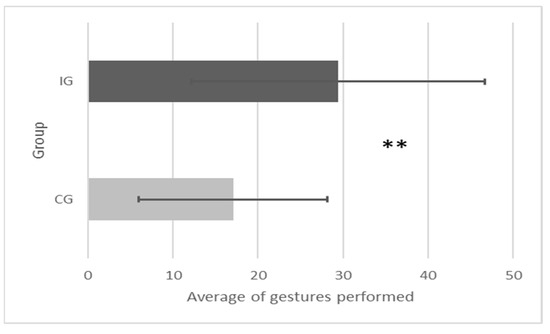 Regarding gestural vocabulary, parents reported 0 and 62 different gestures that were performed by their children, with an average of 24.6 gestures for the total sample. A great variability was observed within each group. However, from the six categories that were considered, both groups produced the most frequent gestures for animals (i.e., “dog”, “bird”), objects (i.e., “airplane”, “car”), and requests (i.e., “give me”, “stop”). From these categories, some gestures only appeared in the IG, such as “elephant”, “bug”, or “butterfly” for animals, “book”, “candle”, or “flower” for objects, and “more”, “please”, and “thank you” for requests. In addition, gestures related to actions (i.e., “drink”, “eat”, “sleep”) and emotions (i.e., “happy”, “sad”, “angry”) only appeared in the IG. When comparing the IG and the CG, the analyses showed that the children in the IG had a significantly greater gestural vocabulary than that of the CG children (t(65) = 3.04; p = 0.004; d = 0.760), with a medium effect size (see Table 2 and Figure 3).