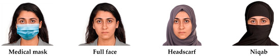 To create different visual conditions, we developed four sets of images, each depicting a young woman (a) not wearing any head covering, (b) wearing a 3-ply surgical mask (which corresponded to the actual procedure followed during stimulus recording), (c) wearing a hijab (headscarf), and (d) wearing a niqab. None of the images represented the actual speakers; the images were drawn from the Bogazici Face Database (Saribay et al. 2018), the London Face Database (DeBruine and Jones 2017), and photos of volunteers from Taylor Reid (2022). The four photographed women were all young adults, portrayed against a neutral background and wearing gray-colored clothing. The original images were prerated by 10 external raters, all residents of Montréal, who first selected the depicted woman’s ethnicity from five broad ethnic categories and then rated her fit to the chosen category using a 100-point scale (100 = “very typical”). The four women were selected as Middle Eastern at a mean rate of 78%, with no statistically significant difference in the typicality ratings, according to paired-samples t tests, ts < 1.63, ps > 0.138, ds < 0.51. A graphic designer then created three additional versions of each original image, with each woman shown wearing a medical mask, a headscarf, and a niqab, as illustrated for one speaker in Figure 1 (see Appendix C for the full image set).