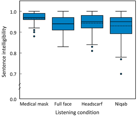 Boxplots of intelligibility scores by listening condition, with dashed lines indicating group means.