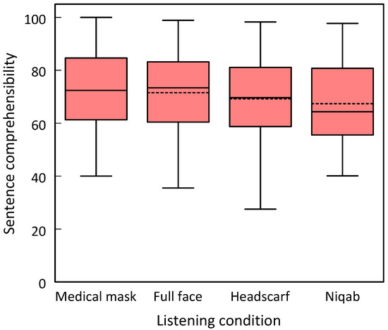 Boxplots of comprehensibility ratings by listening condition, with dashed lines indicating group means.